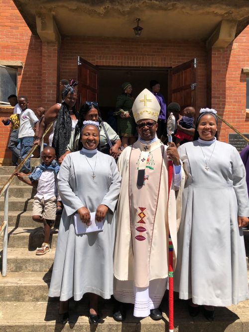 A foto mostra as duas novas professas Ir. M. Laurentia (esquerda) e Ir. M. Simone, junto com o Arcebispo Zolile.
